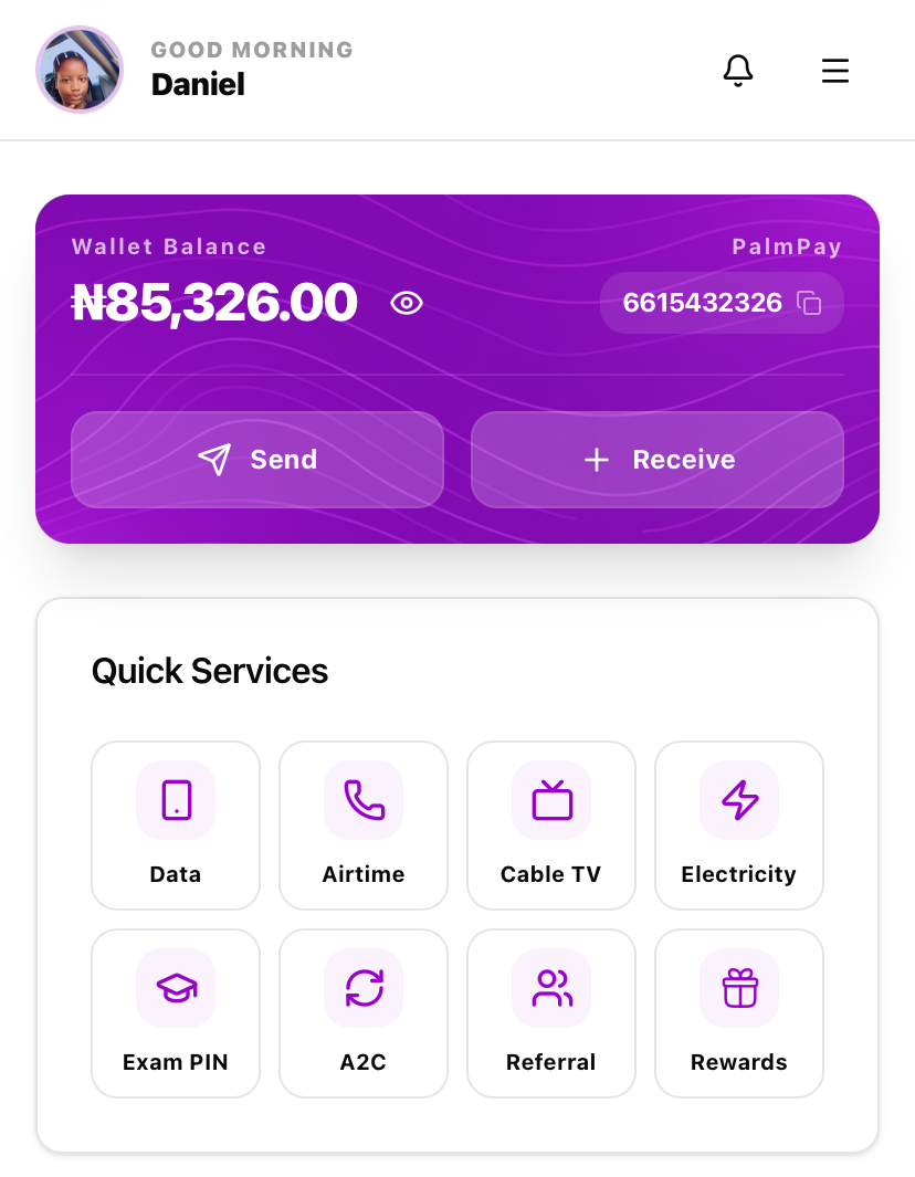 Users can fund once and move straight into airtime, data, electricity, cable, exam PINs, airtime-to-cash, referrals, and rewards without jumping through separate flows.
